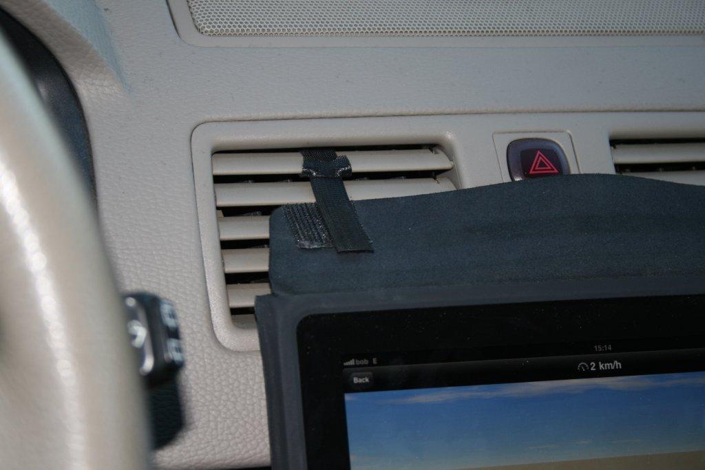 dabei hab ich auf der lasche 2 velcro streifen aufgenaeht und bei meinem lueftungsgitter vom auto ebenfalls 2 velcor streifen lose durchgefaedelt.
