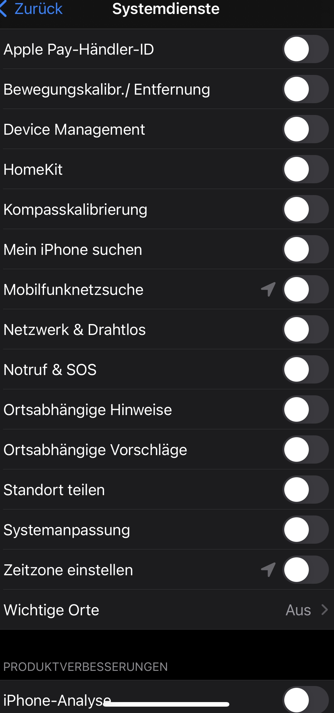 Ich hab in diesem Menü tatsächlich nur die iPhone Suche aktiviert. Ob du die aktivieren willst oder nicht, ist dir selbst überlassen, das ist halt eine Abwägung zwischen Privatsphäre und wie wahrscheinlich ist es dass mir das iPhone mal geklaut wird / ich es verliere. Ich würde diese Einstellung am liebsten auch abschalten, weil sie sicherlich den mit am stärksten Eingriff in die Privatsphäre darstellt, aber ich kenne mich halt, ich bin ein Tollpatsch, und rechne deshalb täglich damit, dass ich mein Handy irgendwo liegen lasse oder es geklaut wird. Da musst du sicherlich selbst abwägen, wie wahrscheinlich das bei dir ist, und was dir wichtiger ist die anderen Einstellungen auszuschalten hat aber bei mir noch nie irgendwelche Nachteile gehabt