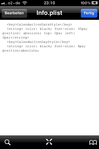 (09.11.2010, 23:55)Uhoffi schrieb: Die Farbe der Schrift im Kalendericon mußt du in der Info.plist von deinem Theme ändern.