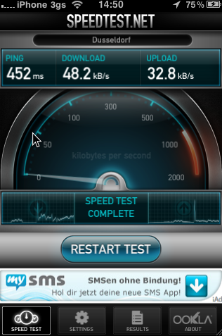 Hier mal meine aktuelle Leistung via UMTS indoor.... surfen macht selten Spass mit dem Netz... aber es ist ausreichend um mal unterwegs online zu surfen.
