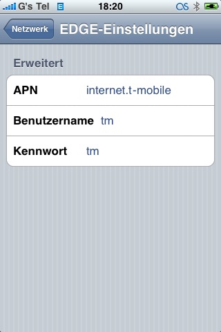 EDGE-Einstellungen zu bekommen, hab ich einige Einstellungen per SSH vorgenommen. Ich glaube bei Sendowski.de gibt es für alle T-Mobile Kunden eine kleine App., die dies auch ermöglicht. TMobile EDGE edit heisst sie wohl.
