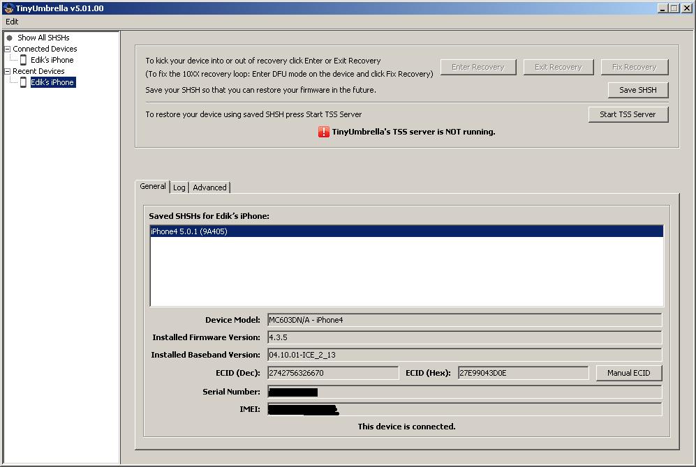 Auf dem Gerät befindet sich die 4.3.5. aber TinyUmbrella findet nur nen SHSH File für die 5.0.1...