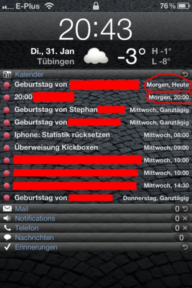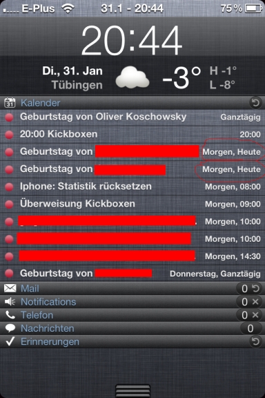- "Geburtstag von xxxx" mit Termin "Morgen, Heute" (Soll: Heute)