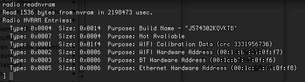 Was wird denn bei den Wifi Calibration Data angezeigt? Und was steht in der Zeile "Read .. bytes from nvram in ... usec."?