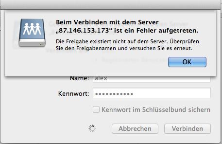 Und wenn ich im Finder unter "Gehe zu - mit Server verbinden" die Adresse des Speedports eingebe, erhalte ich folgende Fehlermeldung