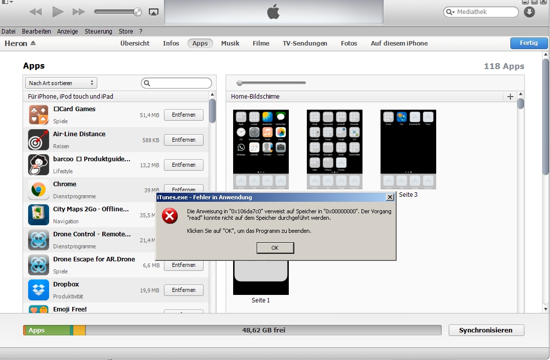 iTunes bringt Fehler bei klicken auf "Apps"