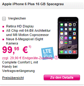 Zitat:Sie können Ihren Vertrag gegen einen Endgeräte-Zuschlag vorzeitig verlängern. Der Endgeräte-Zuschlag beläuft sich auf 14,95 € pro Monat Vorfälligkeit (der angefangene Monat wird dabei voll berechnet). Der Endgeräte-Zuschlag wird auf der Endgeräte-Rechnung, die Ihrer Lieferung beiliegt, ausgewiesen.