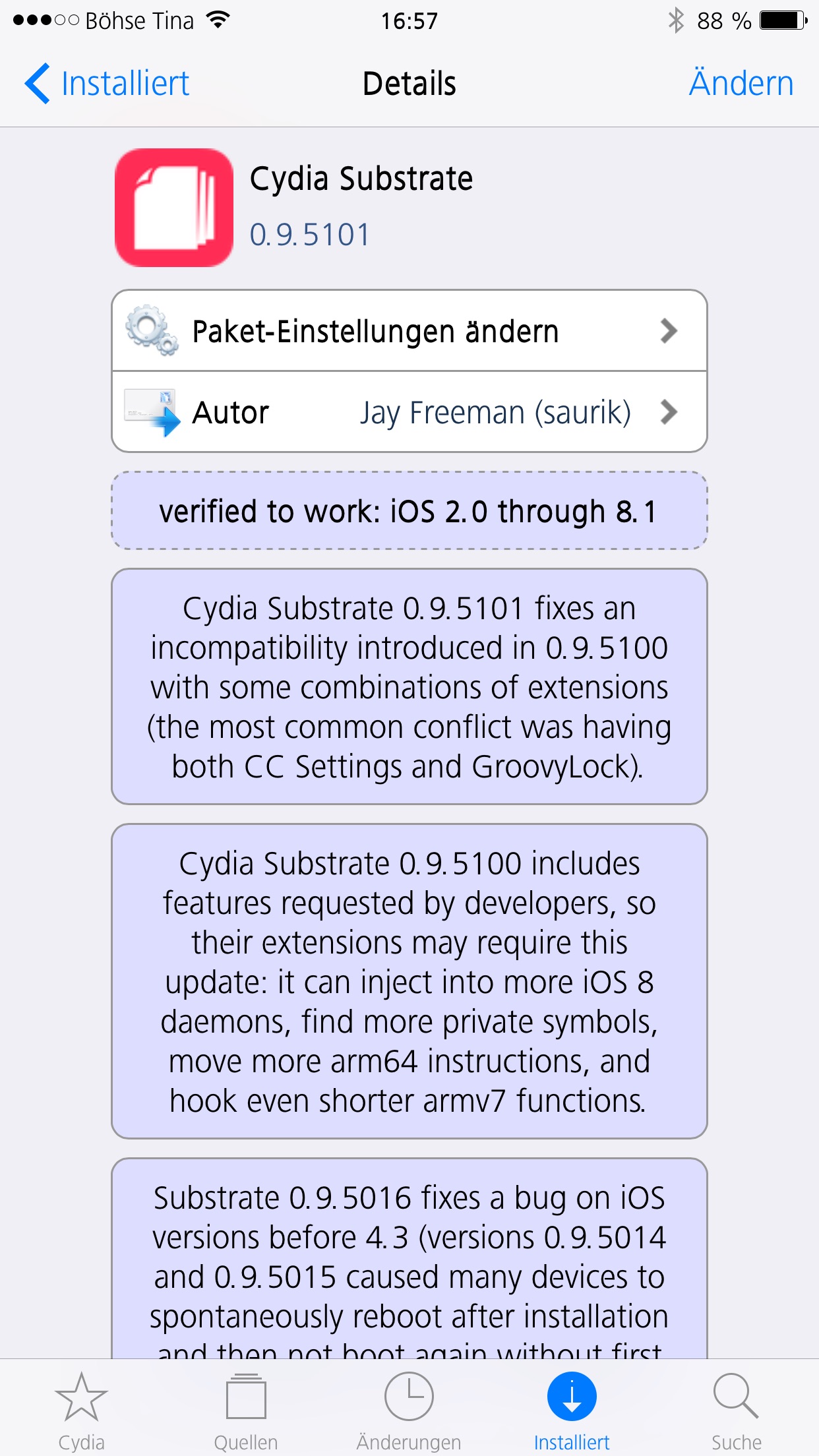 Wenn ihr das neue Update von Cydia Substrate installiert müsst ihr CCSettings deinstallieren sonst landet ihr im Bootloop.