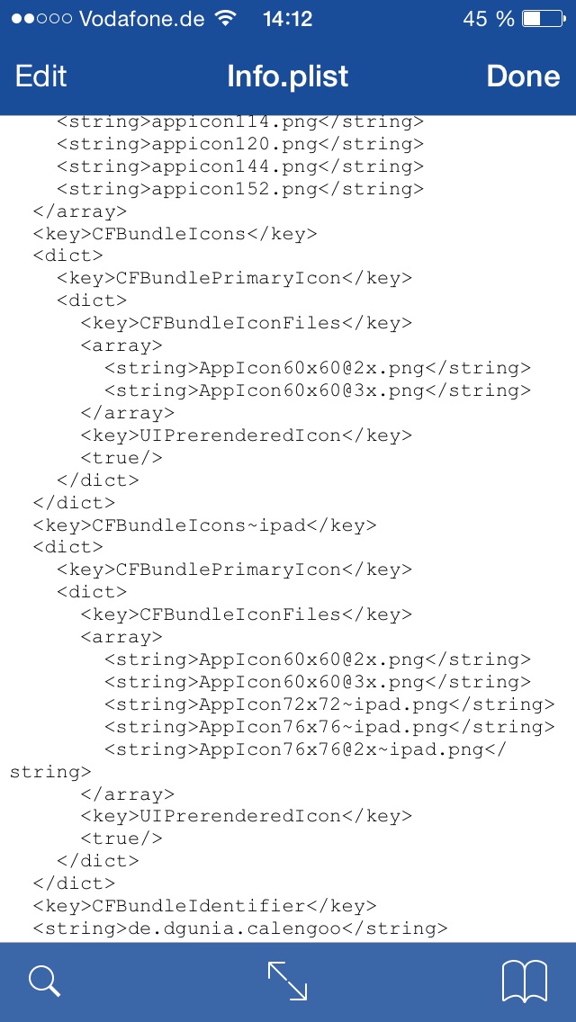 (17.11.2014, 00:42)partychick schrieb: Ja wie gesagt, da musste mal die Info.plist in den Originalapps herzeigen. Ansonsten können wir das schlecht rausfinden ohne die App zu haben.
