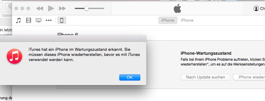 Jetzt hängt es am Mac und iTunes wartet seit ca. 5 Min auf das Iphone. Dieses zeigt das Apple-Logo und den runden Ladebalken, dieser dreht sich allerdings nicht....