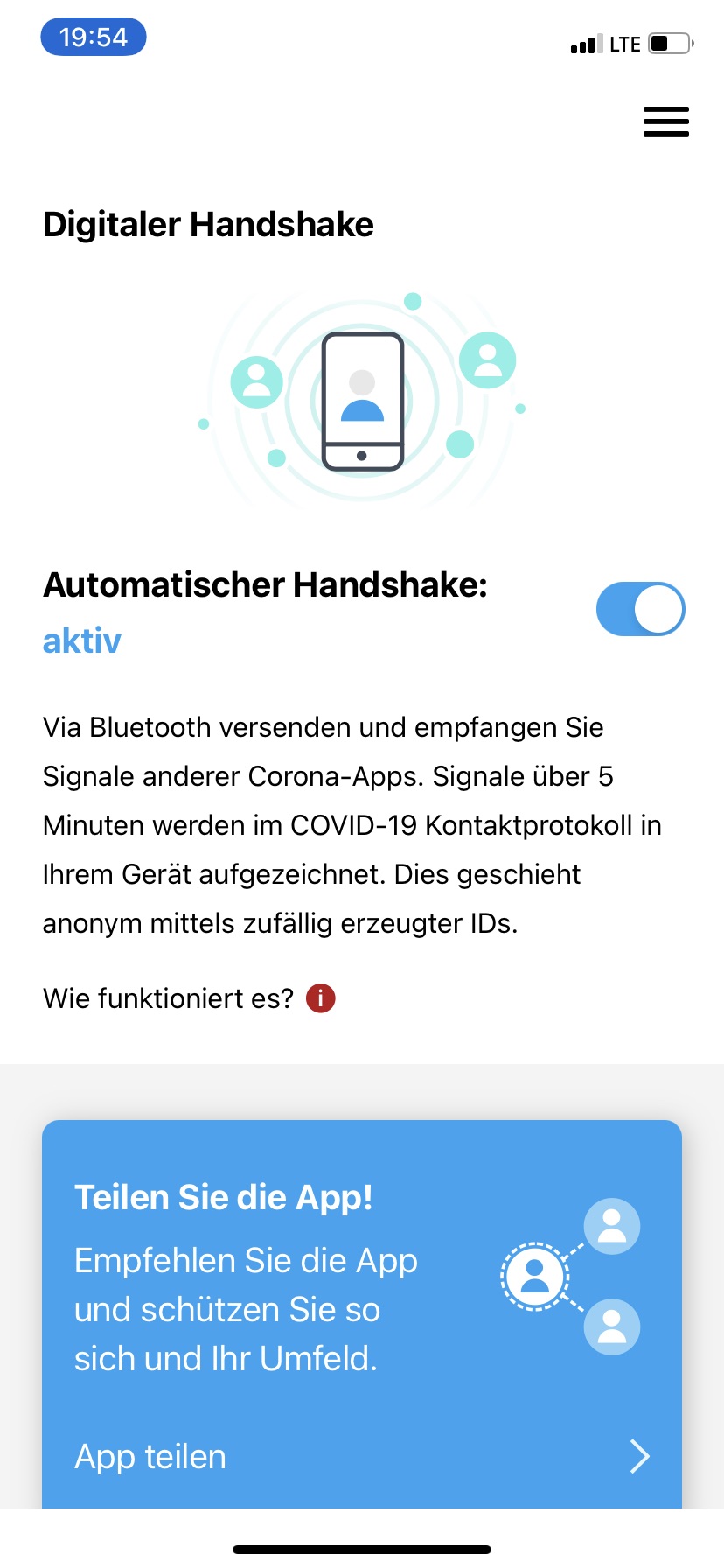 (08.07.2020, 13:54)jo0815 schrieb: Auch in Ö funktioniert der "Automatische Handshake" der STOPP Corona App nicht. Ich denke, sobald öffentlich getestet wird, werden die Betreiber updaten.
