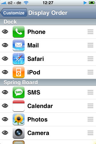 Dann sind nur die Standart-icons im Springboard wieder sichtbar aber in der richtigen Reihenfolge. Alle anderen sind "hidden". Danach bin ich bei X-Launch dann auf jedes, weitere Icon bzw.nachinstallierte Programm gegangen und habe es via "toggle Visibility" wieder aufs Sprigboard gebeamt.