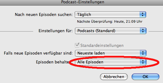 Also schau ich mir iTunes etwas genauer an. Da gibts ja diesen Reiter [Podcasts] wo ich "Synchronisieren: Alle Episoden von allen Podcasts" gewählt habe. Das muss auch so sein, denn egal welche Einstellung sonst ich nehme, es würden ältere Video-Epidsoden gelöscht, die ich behalten will.