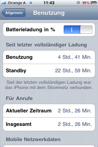 Inkl.26 Minuten Telefonat, kurze Navigation (Navigon ca. 20 Minuten), Musik hören via BT, Mails alle 15 Minuten. 3G, WLan, Ortungsdienste bei Nichtnutzung immer aus...