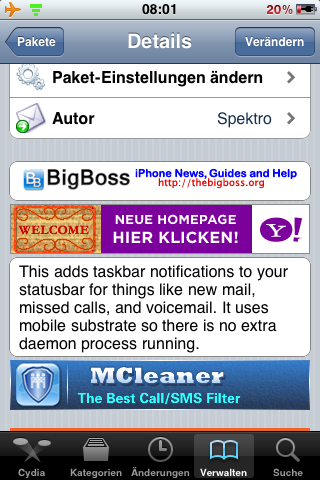 Nun habe ich das Cydia und suche das Programm, welches einen verpassten Anruf in gewissen Abständen mittels Signal bekannt gibt.