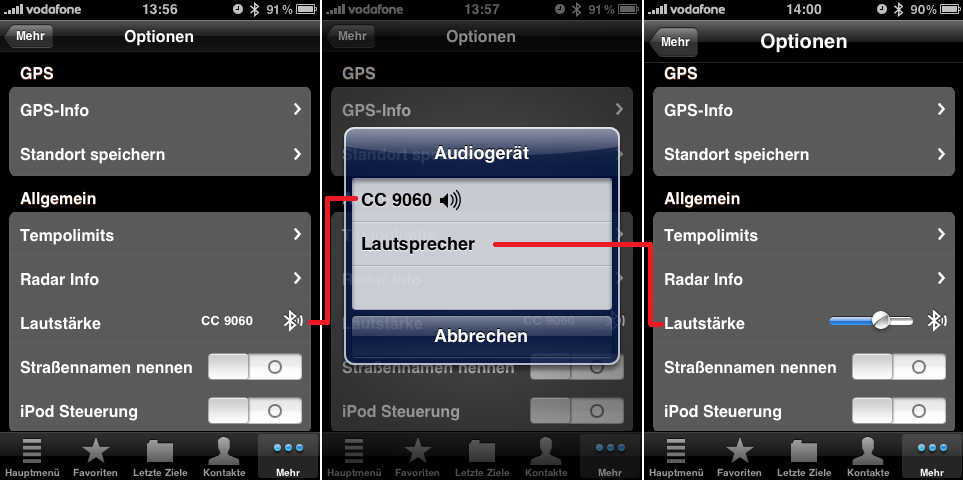 Aber, sobald ich die Zündung oder die Navi Software neu starte, steht wieder meine Freisprecheinrichtung CC9060 drin und ich höre demzufolge keinen Sound mehr. D.h. auf der Autobahn einmal tanken, aussteigen und bezahlen, Auto starten und schon muss ich in der Navi Software die Soundausgabe wieder neu auf die iPhone Lautsprecher einstellen.